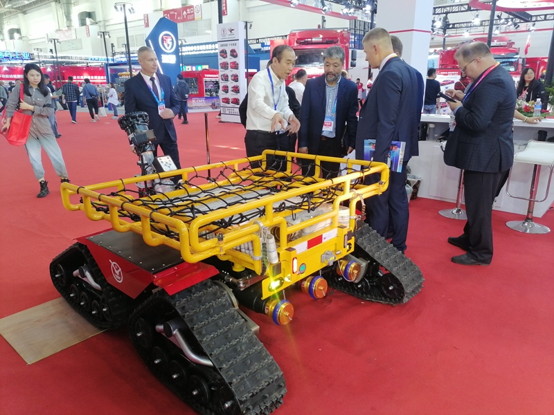 我公司生產的全地形消防滅火機器人—猛虎,是國內首家采用四驅履帶輪式全地形越野底盤的機器人生產廠家。目前在已服役的消防救援隊伍中有極高的評價,是上一屆展會的明星產品。